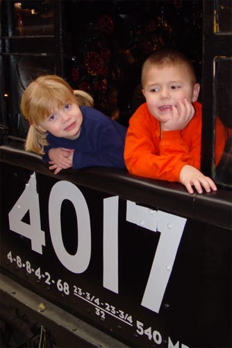 The kids can’t help but hang out of the conductors window of the 4017.